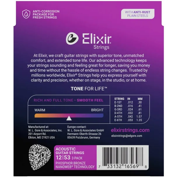 Elixir Strings to wiodąca marka strun powlekanych na świecie.Struny Elixir to jedyne struny na świecie w których zarówno rdzeń jak i owijka są chronione powłoką. Powłoka ochronna działa jak fizyczna bariera która zabezpiecza strunę przed szkodzącymi jej czynnikami takim jak pot czy kurz. Dzięki temu struny te zachowują swoje oryginalne brzmienie o wiele dłużej niż klasyczne a nawet powlekane struny innych firm.
