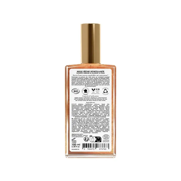Bio Suchy Olejek z Efektem Glow, Utrwalający opaleniznę z serii Alphanova Sun Beauty to suchy olejek o lekkiej, nietłustej teksturze, który rozświetla cerę dzięki 100% naturalnym, złotym drobinkom brokatu. Skóra staje się promienna i pełna blasku dzięki pigmentowanej, delikatnie błyszczącej formule.