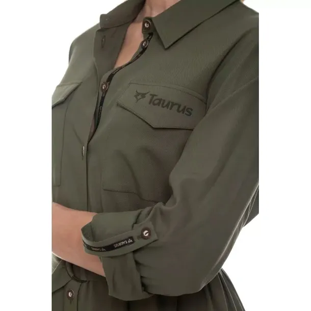 - Sukienka wyposażona jest w taśmy ozdobne z logo marki TAURUS, które stanowią modny detal, podkreślający autentyczność produktu,