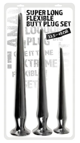 Super Long Flexible Butt Plug Set by You2Toys: 3 x ekstra długi korek analny w różnych rozmiarach i o różnej wadze. Każdy korek jest bardzo elastyczny i zginany z wąską, wrażliwą końcówką i podstawą ssącą, która służy również jako zatyczka.