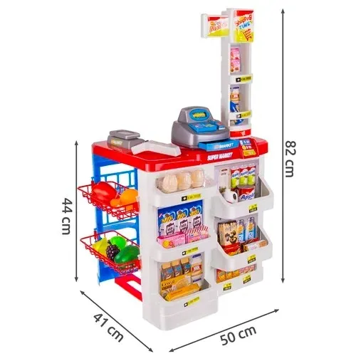 - SPECYFIKACJA – materiał: PP, pozostałe: ABS + PET + papier + PS; zasilanie 2 x bateria AA 1,5 V (brak w zestawie); wymiary supermarketu: 41 × 50 × 82 cm; wymiary wózka: 29 × 20 × 41 cm; waga zestawu: 2,6 kg; waga z opakowaniem: 3 kg.