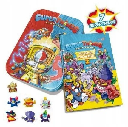 W kolekcjonerskiej, kolorowej metalowej puszce SuperThings znajduje się książka w twardej oprawie zawierająca zabawne komiksy, których bohaterami są Superbohaterowie i Złoczyńcy z Kaboom City. Oprócz tego w zestawie znajduje się 7 losowych figurek SuperThings, w tym jedna rzadka postać w kolorze srebrnym lub złotym. Puszka doskonale nadaje się do przechowywania figurek SuperThings!