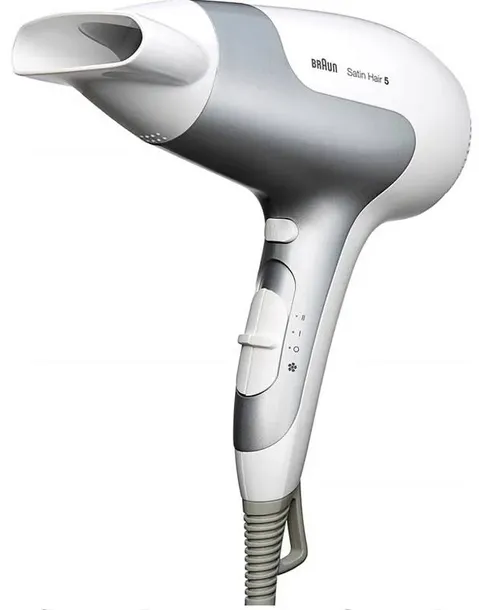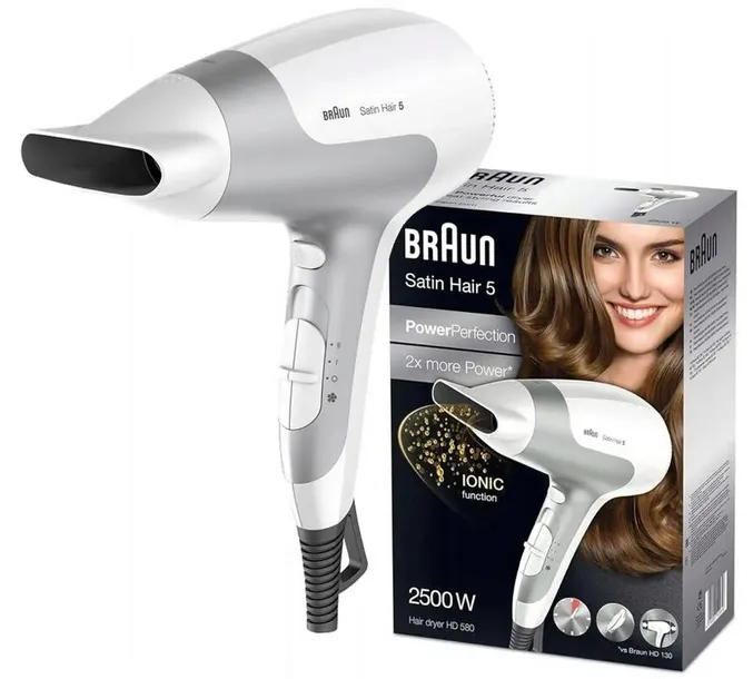 Suszarka do włosów Braun BRHD580E trzema zakresami temperatury, funkcją jonizacji, zimnym nawiewem i dwustopniową regulacją prędkości nadmuchu. Duża moc 2500W zapewnia wydajna pracę urządzenia.