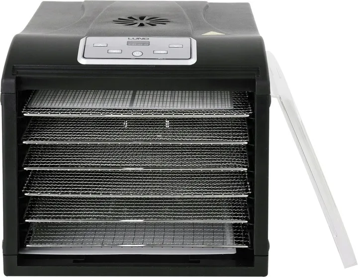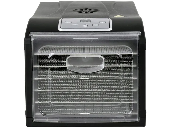 Intuicyjny panel sterowania z wyświetlaczem cyfrowym oraz funkcja zliczania i ustawiania czasu sprawiają, że suszarka LUND 68272 jest niezwykle prosta w obsłudze. Przeźroczyste drzwi umożliwiają wygodną obserwację procesu suszenia, a 6 wysuwanych sit ze stali nierdzewnej ułatwia rozmieszczenie i wyjmowanie produktów.