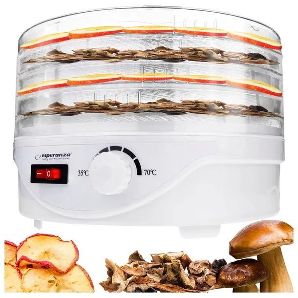Suszarka spożywcza Esperanza DÉLICATESSE 250 W to niezastąpione urządzenie w każdej zdrowej kuchni. Dzięki niej zachowasz smak, aromat i wartości odżywcze ulubionych owoców, warzyw i grzybów bez konieczności stosowania konserwantów. Ciesz się pysznymi, naturalnymi przysmakami o każdej porze roku.