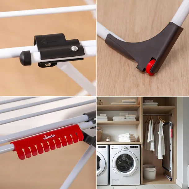 ✅ Suszarka Vileda Doble składa się na płasko, umożliwiając kompaktowe i wygodne przechowywanie, dzięki czemu idealnie nadaje się do domów, w których przestrzeń jest na wagę złota.