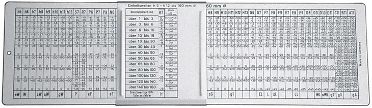 Zastosowanie: do bezpośredniego odczytu otworów podstawowych H6 do H13 według DIN 7154 o średnicy 1-160 mm, jak również wałków podstawowych h5 do h12 według DIN 7155 o średnicy 1-160 mm.