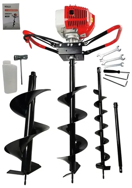Zestaw zawiera wszystko, co niezbędne do efektywnej pracy - świder, trzy wiertła o różnych średnicach (15, 20 i 25 cm), przedłużkę 50 cm, zbiornik na mieszankę paliwową oraz klucze obsługowe. Wszystko, czego potrzebujesz w jednym miejscu.
