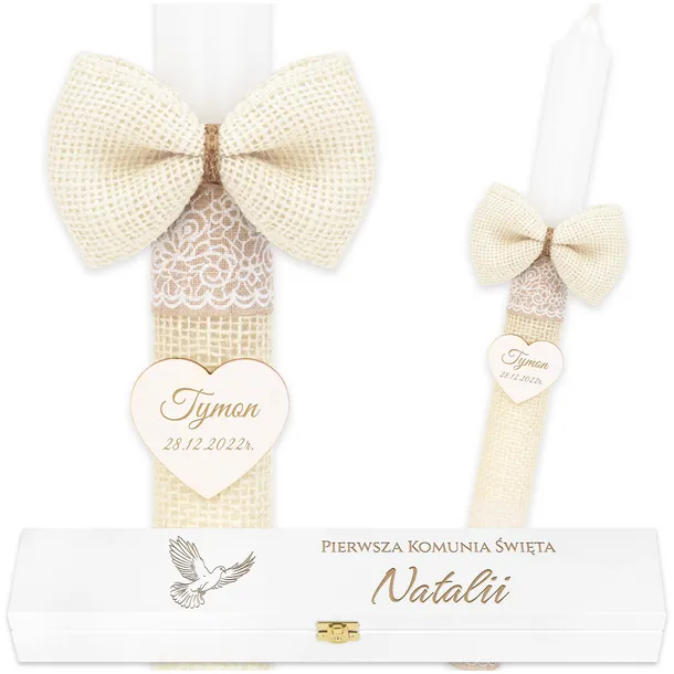 Nasza Świeca na Pierwszą Komunię Świętą to bardzo symboliczny i osobisty element, który uświetni ten wyjątkowy moment. Świeca została starannie wykonana i ozdobiona eleganckim, jutowym materiałem na całej swojej długości. Zarówno dolna, jak i górna część świecy zostały pięknie wykończone delikatną opaską, nadając całości wyjątkowego charakteru.