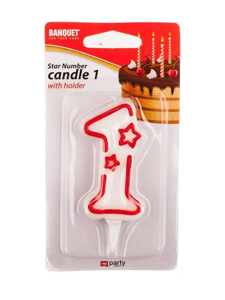 Świeczka urodzinowa nr 1, częścią świeczki plastikowy kołek. Wymiary: 7 x 4,5 cm. Produkt można wykorzystać na imprezę plenerową, piknik itp.