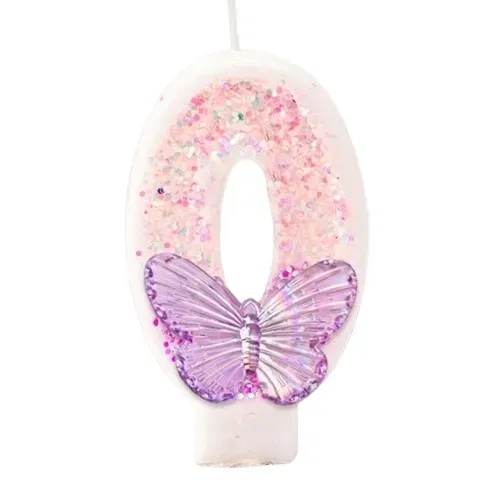 Brokatowa świeczka urodzinowa w kształcie cyfry "0" z motywem motylka