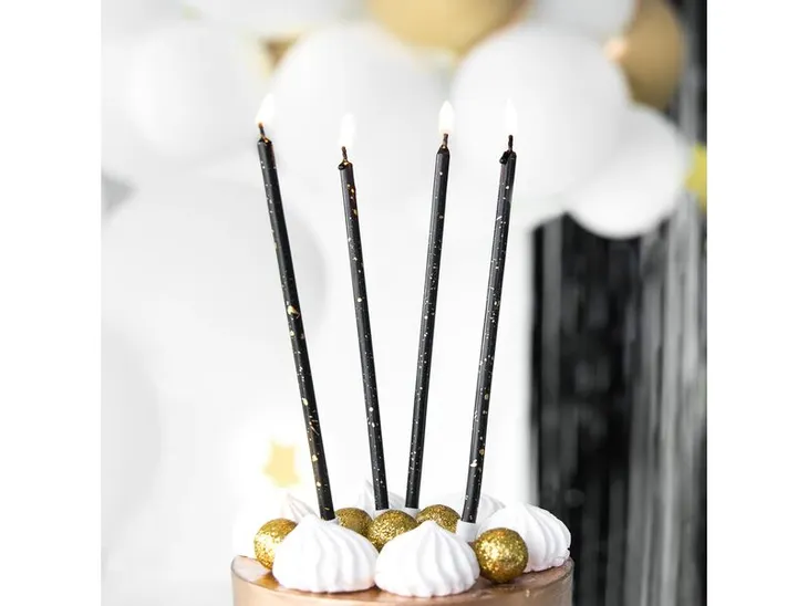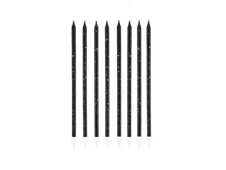 Świeczki urodzinowe długie, czarne z złotymi plamkami, 8 szt.