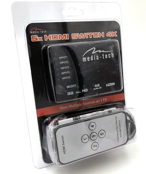 5xHDMI SWITCH służy do przełączania obrazu z aż 5 różnych urządzeń podłączonych do portów wejściowych przełącznika.