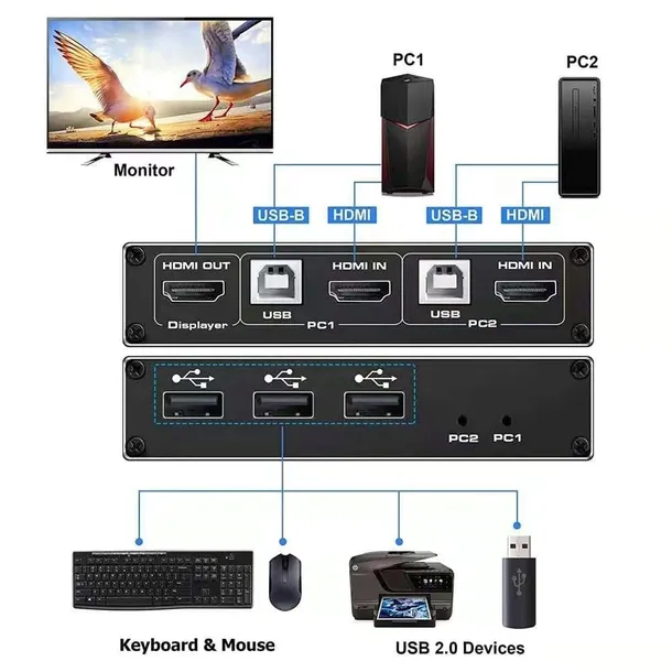 Switch KVM USB może kontrolować dwa komputery za pomocą jednego zestawu mysz, klawiatura i wyświetlać obraz na jednym wyświetlaczu (monitorze, TV)