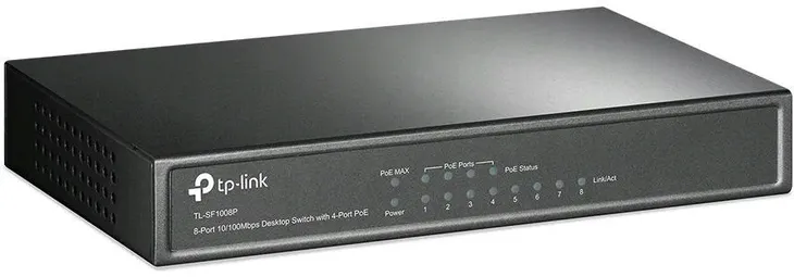 Przełącznik PoE TL-SF1008P posiada 8 portów RJ45 o prędkości 10/100Mb/s, nie wymagających konfiguracji. 4 z nich (1-4) obsługują funkcję Power over Ethernet (PoE). Przełącznik automatycznie wykrywa urządzenia PD działające w standardzie IEEE 802.3af i zaopatruje je w energię. Pozwala to rozszerzyć zasięg sieci w miejscach, w których nie ma dostępu do gniazd lub linii zasilających, a gdzie istnieje potrzeba umieszczenia punktów dostępowych, kamer IP, telefonów IP, itp.