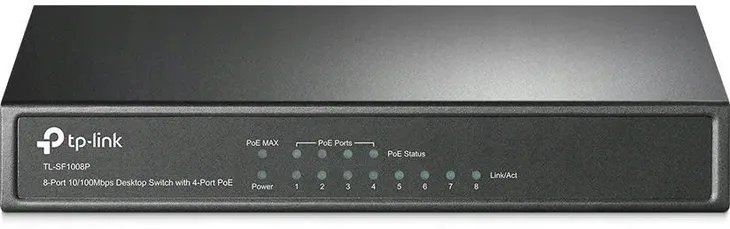 Przełącznik PoE TL-SF1008P posiada 8 portów RJ45 o prędkości 10/100Mb/s, nie wymagających konfiguracji. 4 z nich (1-4) obsługują funkcję Power over Ethernet (PoE). Przełącznik automatycznie wykrywa urządzenia PD działające w standardzie IEEE 802.3af i zaopatruje je w energię. Pozwala to rozszerzyć zasięg sieci w miejscach, w których nie ma dostępu do gniazd lub linii zasilających, a gdzie istnieje potrzeba umieszczenia punktów dostępowych, kamer IP, telefonów IP, itp.