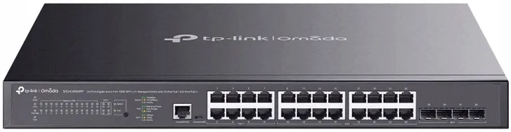 TP-Link SG3428XMPP to zarządzalny przełącznik L2+ Omada, wyposażony w 24x porty Gigabit Ethernet (w tym 16x portów PoE+ i 8x portów PoE++) oraz 4x sloty 10Gb/s SFP+.