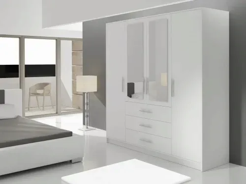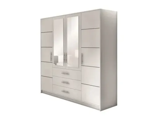 Funkcjonalna szafa Bali D4. Stworzona by ułatwić organizację ubrań oraz zgromadzenie ich w jednym miejscu. We wnętrzu znajdziemy półki, szuflady oraz miejsce na wieszaki. Szafa jest dostępna w dwóch wersjach kolorystycznych, przez co każdy dopasuje ją do swoich potrzeb. Uzupełnieniem całości są stylowe uchwyty. Dzięki lustrom umiejscowionym w centralnej części mebla wnętrze będzie wydawać się większe.