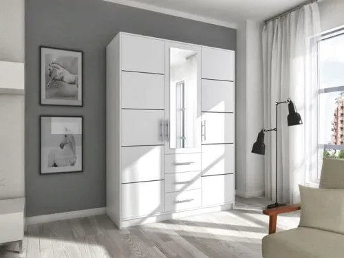 Funkcjonalna szafa Bali D3. Stworzona by ułatwić organizację ubrań oraz zgromadzenie ich w jednym miejscu. We wnętrzu znajdziemy półki, szuflady oraz miejsce na wieszaki. Szafa jest dostępna w dwóch wersjach kolorystycznych, przez co każdy dopasuje ją do swoich potrzeb. Uzupełnieniem całości są stylowe uchwyty. Dzięki lustrom umiejscowionym w centralnej części mebla wnętrze będzie wydawać się większe.