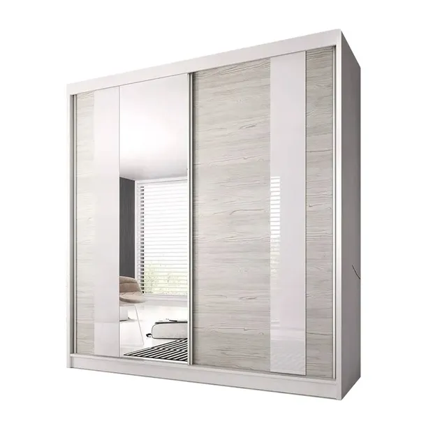 Pakowana szafa przesuwna w wielu wersjach kolorystycznych ze szklanymi wstawkami z drążkiem i półkami. Szafa dzięki systemowi drzwi przesuwnych staje się bardzo wygodna użytkowaniu. Idealna do sypialni, przedpokoju lub korytarzu. W środku podzielona jest na dwie części wyposażone w półki i drążek na ubrania. W szafie zastosowany został bardzo solidny system drzwi przesuwnych (metalowe prowadnice + rolki na łożyskach) dzięki któremu drzwi płynnie, lekko i bez żadnego problemu się przesuwają.