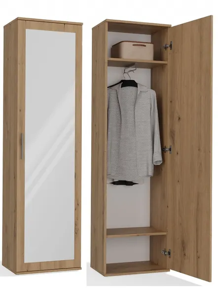 - W środku szafy dwie praktyczne półki oraz uchwyt na wieszaki.