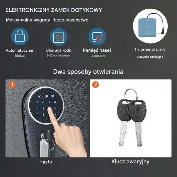 - ✅ Inteligentna blokada: Ekran dotykowy z kodem 3-12 cyfr i automatycznym zamykaniem.