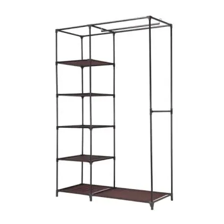 Pokrowiec garderoby nie zakrywa całości stelaża, kończy się nad dolnymi półkami.