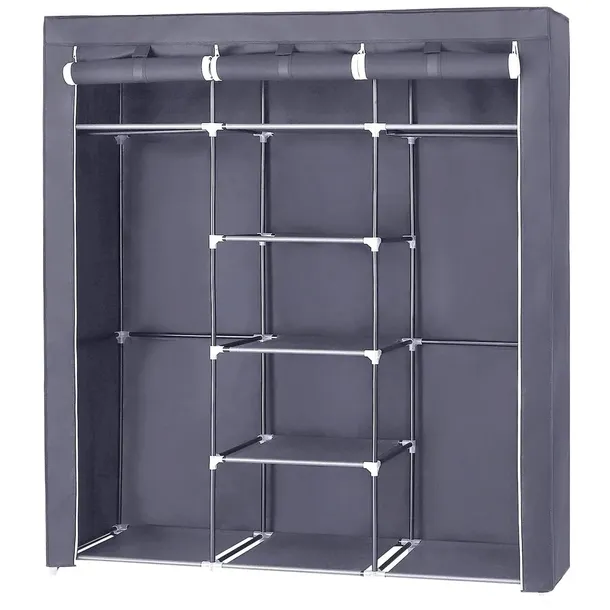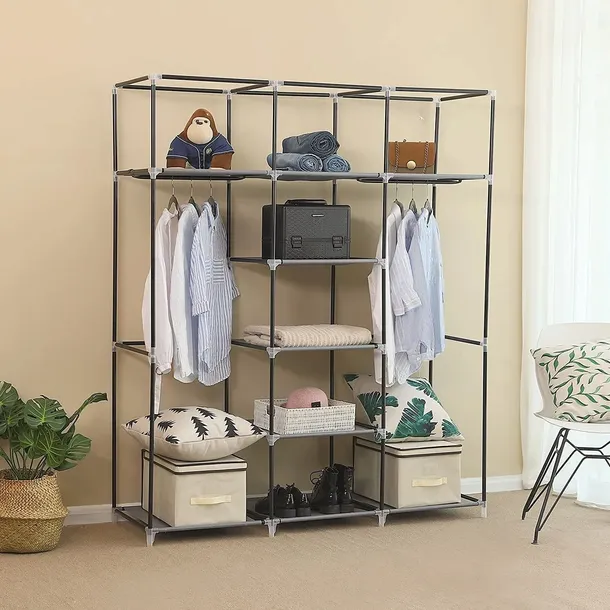 Wyjątkowo praktyczna, składana garderoba, posiada 9 półek, które zostały wyprodukowane z wodoodpornego materiału oraz 2 drążki do zawieszania ubrań.