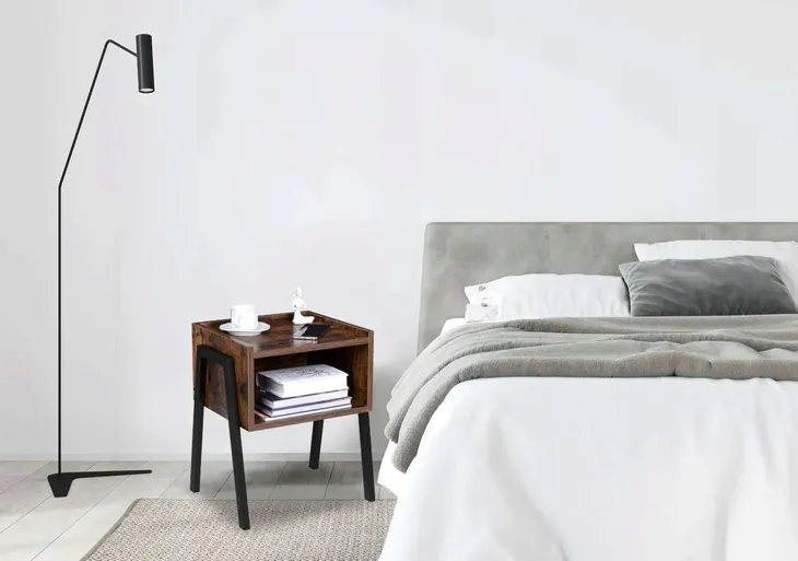 Skive to wyjątkowa i praktyczna szafka nocna. Wykonana z materiałów najwyższej jakości z zachowaniem dbałości o każdy szczegół. Solidna konstrukcja ze stali malowanej proszkowo i laminowane płyty przypominające postarzany dąb świetnie się łączą, tworząc szafkę nocną o nowoczesnym wzornictwie. Model doskonale sprawdzi się w oryginalnie urządzonych pomieszczeniach. Idealnie pasuje do stylu loftowego, industrialnego i vintage. Skive to uniwersalny model. Dzięki kompaktowej przemyślanej konstrukcji może on pełnić również funkcję np. bocznego stolika przy sofie. Półki i duża wnęka bez problemu pomieszczą ulubione książki, czasopisma i rzeczy, których potrzebujemy pod ręką, jak okulary czy telefon.