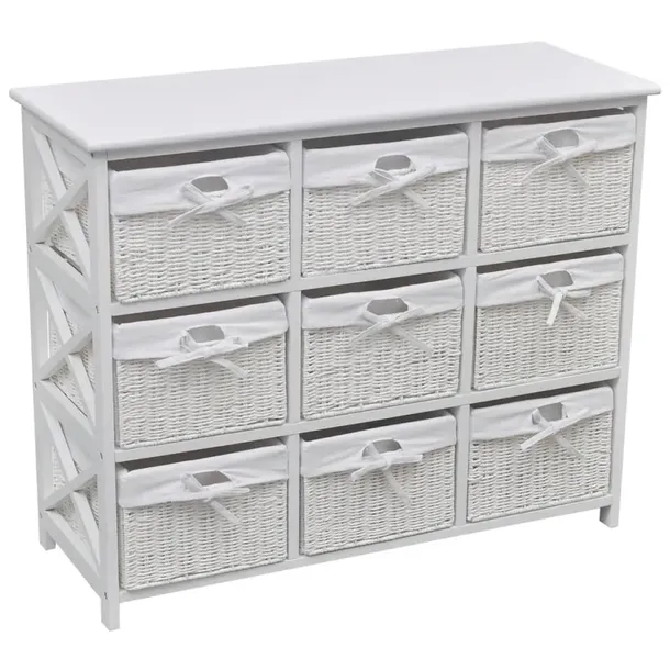 Szafka wyposażona jest w 9 wyplatanych koszyków, a każdy z nich wyłożono tkaniną, którą można prać. Mebel ten został pomalowany na biało, co czyni go trwałym i łatwym do czyszczenia.