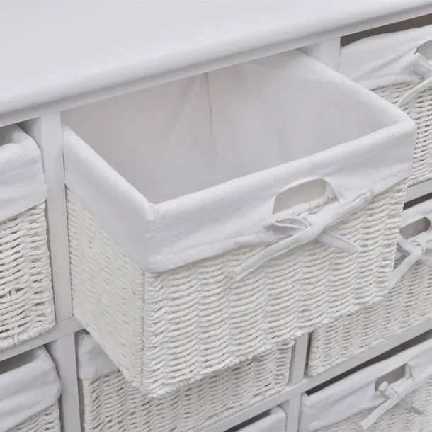 Szafka wyposażona jest w 9 wyplatanych koszyków, a każdy z nich wyłożono tkaniną, którą można prać. Mebel ten został pomalowany na biało, co czyni go trwałym i łatwym do czyszczenia.