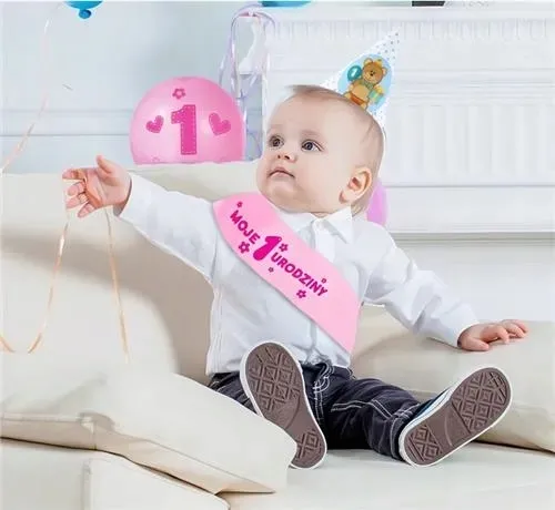 Różowa szarfa z napisem Moje 1 urodziny,