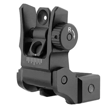 Szczerbina UTG MNT-955 to niskoprofilowy składany przeziernik do karabinków AR15, w pełni kompatybilny z fabryczną muszką oraz kolimatorami.