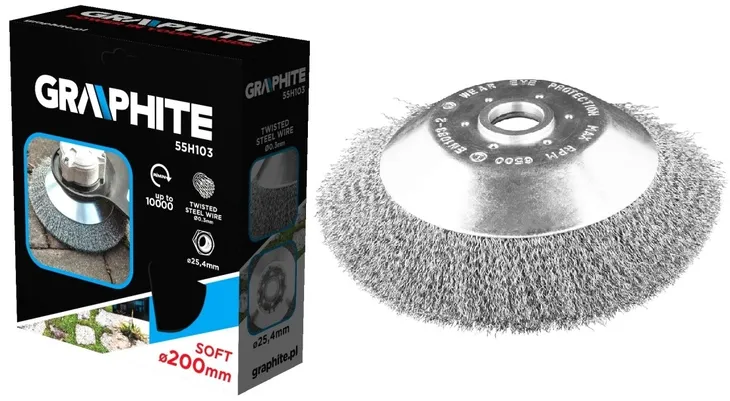 Szczotka druciana do kosy spalinowej 200 x 25,4 mm, miękka, druty falowane 55H103 marki GRAPHITE to tarcza szczotkowa do kos spalinowych. Posiada wymiary 200 x 25,5 mm średnicy zewnętrznej oraz wewnętrznej otworu. Umożliwia dokładne czyszczenie kostek brukowych oraz metalowych powierzchni. Wykonana została z trwałych, falowanych drutów.