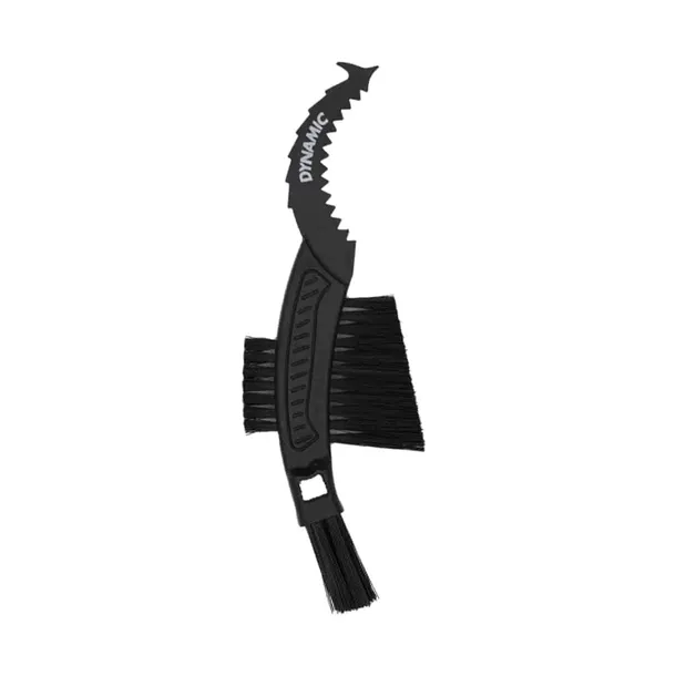Szczotka pazurowa Dynamic to wielofunkcyjna szczotka serwisowa, idealna do czyszczenia łańcucha, kasety, przerzutek oraz kółeczek (pulley wheels) — ma trzy szczotki z twardym włosiem nylonowym oraz pazur do usuwania zbitego błota i zatorów z trudno dostępnych miejsc.