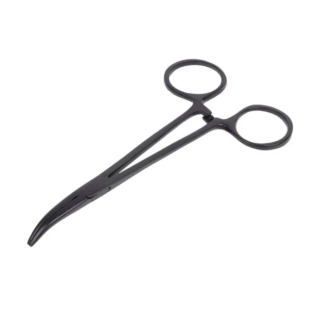 Tradycyjne, zakrzywione szczypce z ząbkowanym uchwytem. Wykonane ze stali nierdzewnej z czarnym wykończeniem.