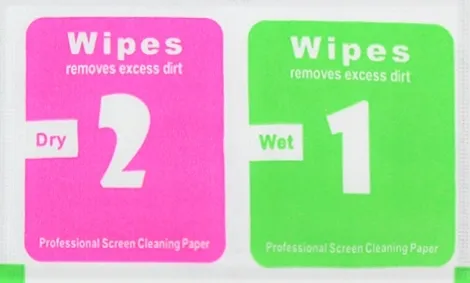 - Ściereczka nr. 1 - mokra, nasączona alkoholem do odtłuszczenia powierzchni ekranu