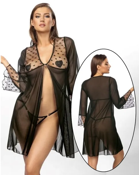 To zestaw idealny na fantazyjne urozmaicenie tego, co dzieje się za zamkniętymi drzwiami sypialni i pozwala poczuć się pewnie i seksownie nawet nieśmiałej kobiecie. Wszystkie szycia wykonano z najwyższą dbałością o szczegóły, dzięki czemu ten erotyczny szlafrok jest bardzo komfortowy i nie podrażnia skóry. Przezroczysty, czarny tiul jest miękki w dotyku i bardzo przewiewny.
