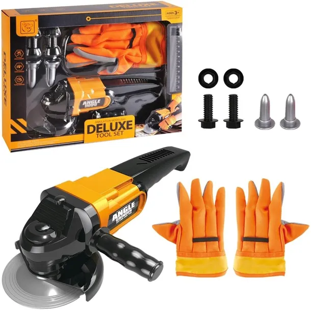Zestaw Narzędzi Kątowych "DELUXE TOOL SET" dla Małego MajsterkowiczaNauka poprzez zabawę w warsztat! Ten realistyczny zestaw narzędzi kątowych to idealna zabawka dla małego majsterkowicza, który chce naśladować tatę lub mamę podczas domowych napraw i prac budowlanych.Główne Cechy Produktu:Realistyczna Kątówka: Głównym elementem zestawu jest duża, pomarańczowo-czarna kątówka (szlifierka kątowa) o realistycznym wyglądzie, bezpieczna dla dziecka.Akcesoria Ochronne: Zestaw zawiera kluczowe elementy niezbędne do zabawy w bezpieczne prace:o Rękawice Ochronne: Duże, pomarańczowe rękawice w stylu roboczym.Elementy Montażowe: W komplecie znajdują się małe plastikowe śruby, podkładki i nity/kołki do wkręcania i montażu.Rozwój Umiejętności: Zabawka wspiera rozwój motoryki małej, koordynacji wzrokowo-ruchowej oraz zachęca do kreatywnego, konstrukcyjnego myślenia i odgrywania ról.Idealny na Prezent: Zestaw jest elegancko zapakowany w pudełko z okienkiem i nadrukiem DELUXE TOOL SET.Specyfikacja:Nazwa: DELUXE TOOL SET - Kątówka (Szlifierka Kątowa)Wiek Dziecka: 3 lata + (zgodnie z oznaczeniem na opakowaniu)Kolorystyka: Pomarańczowo-Czarna (z akcesoriami w kolorze pomarańczowym)Materiał: Plastik, Tkanina (rękawice).Wielkość : 33x25x9