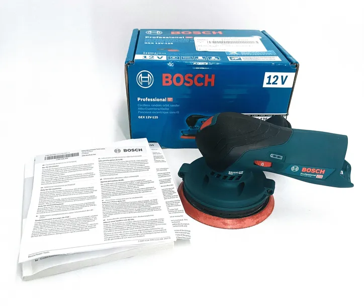- Akumulatorowa szlifierka mimośrodowa BOSCH GEX 12V-125 Professional (korpus – bez akumulatorów i bez ładowarki)