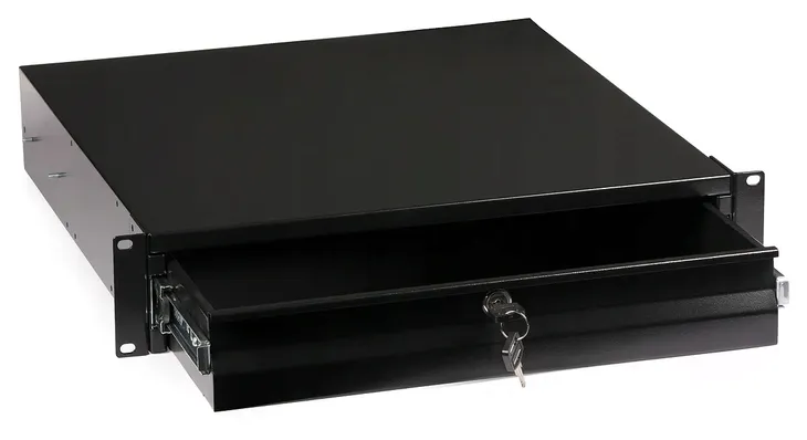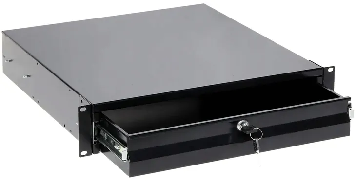 Wysuwana półka umożliwia przechowywanie luźnych elementów w szafie RACK. Półka zamykana jest na zamek z kluczykiem.