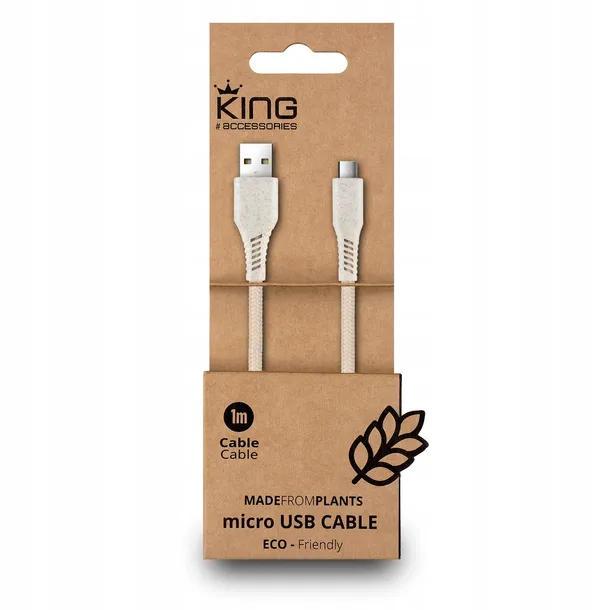 Nowoczesny oraz ekologiczny kabel ładujący marki KING. Zaprojektowany z troską o środowisko naturalne. Osłony przewodów wykonane zostały z podlegającego recyclingowi nylonu, twarde elementy obudowy z przyjaznego dla środowiska tworzywa biodegradowalnego (stworzonego z pszenicznych otrębów), zaś opakowanie wykonane z papieru pochodzącego z recyklingu.