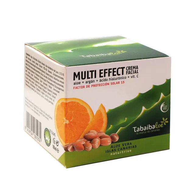 Nowa, mocno wzbogacona formuła dobrych kremów Tabaibaloe. Następca znakomitego kremu Tabaibaloe Caracol, który sprzedawaliśmy kilka lat. Jesteśmy bezpośrednim importerem Tabaibaloe od 2011 roku. Krem MultiEfekt z aloesem, olejkiem arganowym, kwasem hialuronowym, witaminą C ma działanie nawilżające, działa kojąco na skórę, zmiękcza skórę twarzy. Działa przeciwutleniająco i regenerująco. Krem ma działanie zwiększające produkcję kolagenu. Zaś kwas hialuronowy nadaje skórze atłasowej miękkości i elastyczności. Dzięki temu skóra wygląda zdrowiej. Czynnik SPF czyli poziom filtru przeciwsłonecznego ma wartość 15.