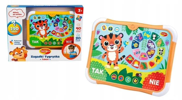 Tygrysek ukrył w labiryncie pytań zagadki z przeróżnych kategorii. Zmierz się z wyzwaniem, odpowiadając na pytania, poprzez naciskanie przycisków TAK i NIE. Poza trybem gry, na sprytne szkraby czekają tu też wesołe dźwięki i melodie. Narożniki tabletu świecą kolorowo, umilając zabawę. Zabawka została wyposażona w regulację głośności, a także w praktyczną, rozkładaną podstawkę, co pozwoli dostosować tablet do indywidualnych potrzeb malucha