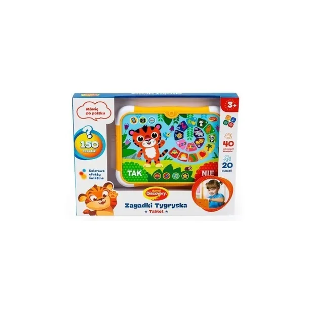 Tygrysek ukrył w labiryncie pytań zagadki z przeróżnych kategorii. Zmierz się z wyzwaniem, odpowiadając na pytania, poprzez naciskanie przycisków TAK i NIE. Poza trybem gry, na sprytne szkraby czekają tu też wesołe dźwięki i melodie. Narożniki tabletu świecą kolorowo, umilając zabawę. Zabawka została wyposażona w regulację głośności, a także w praktyczną, rozkładaną podstawkę, co pozwoli dostosować tablet do indywidualnych potrzeb malucha.