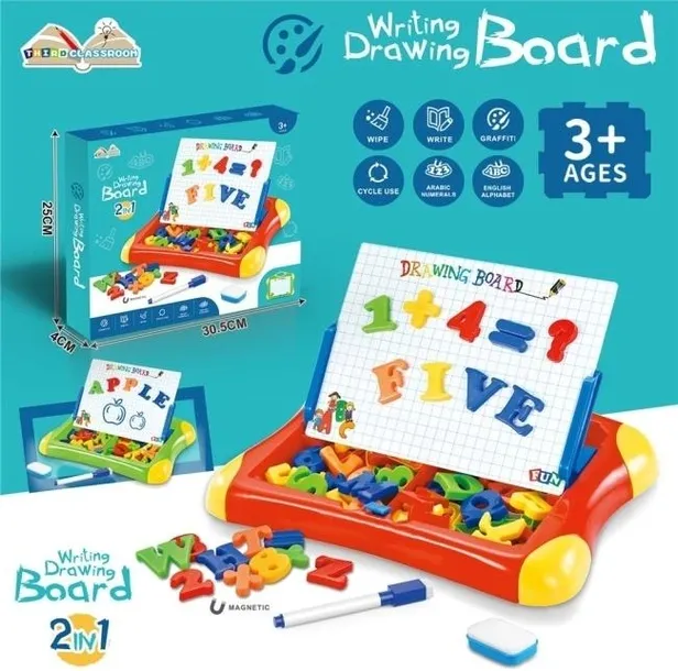 Odkryj fantastyczną tablicę edukacyjną do pisania i rysowania 2w1, stworzoną z myślą o dzieciach w wieku 3 lat i starszych. Ten wszechstronny zestaw to idealne połączenie zabawy i nauki. Tablica jest magnetyczna, co pozwala na układanie kolorowych liter (angielski alfabet) i cyfr (arabskie), które pomagają w poznawaniu podstaw matematyki i języka. Dzięki dołączonemu mazakowi i gąbce, dzieci mogą również ćwiczyć pisanie, rysowanie i graffiti bezpośrednio na białej powierzchni tablicy. Tablica jest wielokrotnego użytku, co sprzyja cyklicznej zabawie. Wszystkie elementy, w tym litery, cyfry, mazak i gąbka, można wygodnie przechowywać w czerwono-żółtej podstawie, która jednocześnie służy jako praktyczny stojak na tablicę. Kompaktowe wymiary 30,5 cm na 25 cm na 4 cm sprawiają, że tablica jest łatwa do przenoszenia i idealna do domu lub podróży. To doskonały sposób na rozwijanie kreatywności, zdolności motorycznych i umiejętności wczesnoszkolnych u Twojego dziecka.