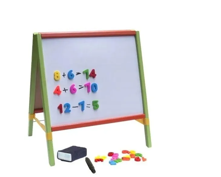 Drewniana dwustronna, magnetyczna, rozkładana tablica Z LICZYDŁEM. Wyposażona w zegar, a w nim ruchome wskazówki. Posiada jednorzędowe liczydło, zawierające 5 różnokolorowych kulek. Gąbka i kredę. Do tablicy dołączany jest marker.