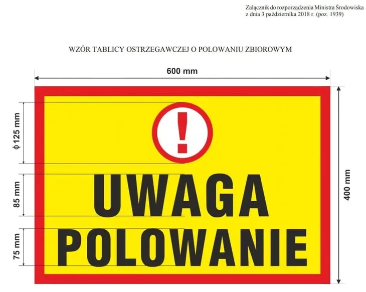 Od 15.10.2018r. obowiązuje rozporządzenie Ministra Środowiska z dnia 3 października 2018 r. w sprawie tablicy informującej o polowaniu zbiorowym (Dz.U. z 2018 r. poz. 1939). Dzierżawca lub zarządca obwodu łowieckiego rozmieszcza tablice w odległości od 200 do 1000 m od granicy obszaru polowania zbiorowego, na którym odbywają się pędzenia.