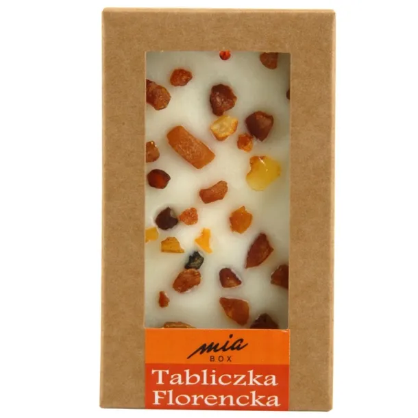 Ręcznie wykonana, niepowtarzalna tabliczka z wosku sojowego z dodatkiem olejków zapachowych, masła shea, suszonych kwiatów, owoców, ziół, ziaren oraz innych ekologicznych zdobień. Powoli uwalniając swój piękny zapach aromatyzuje pomieszczenia i poprawia nastrój. To estetyczny nośnik wspaniałych nut zapachowych, które równocześnie służą jako unikalne elementy dekoracji. Tabliczka florencka jest naturalnym, ekologicznym zamiennikiem syntetycznych zawieszek zapachowych do szerokiego zastosowania. Umieść ją na komodzie, zawieś w łazience, włóż do szuflady lub szafy, a jej wnętrze wypełni się pięknym, uwodzicielskim zapachem. To wspaniały prezent, oryginalny i niepowtarzalny. Nie ma dwóch takich samych tabliczek. Ich wykonanie to 100% handmade;).