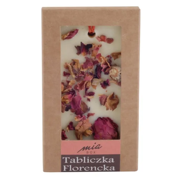 Ręcznie wykonana, niepowtarzalna tabliczka z wosku sojowego z dodatkiem olejków zapachowych, masła shea, suszonych kwiatów, owoców, ziół, ziaren oraz innych ekologicznych zdobień. Powoli uwalniając swój piękny zapach aromatyzuje pomieszczenia i poprawia nastrój. To estetyczny nośnik wspaniałych nut zapachowych, które równocześnie służą jako unikalne elementy dekoracji. Tabliczka florencka jest naturalnym, ekologicznym produktem do szerokiego zastosowania. Umieść ją na komodzie, zawieś w łazience, włóż do szuflady lub szafy, a jej wnętrze wypełni się pięknym, uwodzicielskim zapachem. To wspaniały prezent, oryginalny i niepowtarzalny. Nie ma dwóch takich samych tabliczek. Ich wykonanie to 100% handmade;).